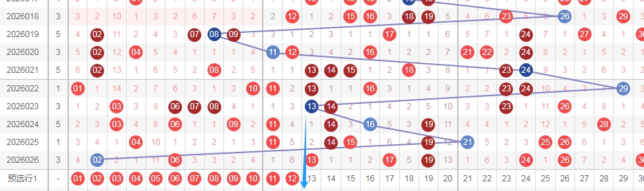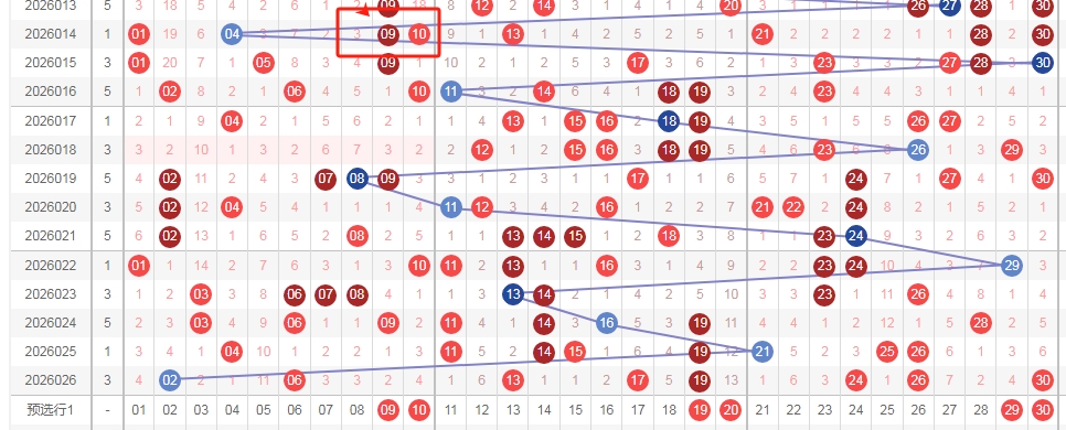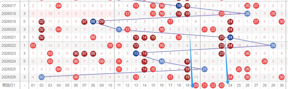 上图是福彩七乐彩开奖号码走势分布图,我在上面走势图中标注出来的数字一共有12个,这12个数字上期只开出了一个数字06,最近两期这个区域也只出现了3个数字,那么本期这个区域的数字大家都可以留意留意出2个或者3个吧。