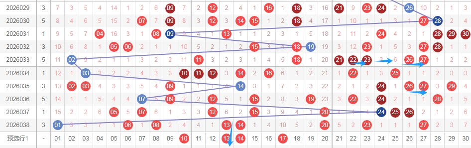 上图是福彩七乐彩开奖号码走势分布图,我标注出来的蓝色小箭头看看表示相似的地方,上面数字19 22 24其中数字22 24是跨度二组合,那么上期开出了跨度二组合0608本期可以考虑一下0306跨度三组合和0811跨度三组合,因为上面跨度二组合2224带了1922跨度三组合。