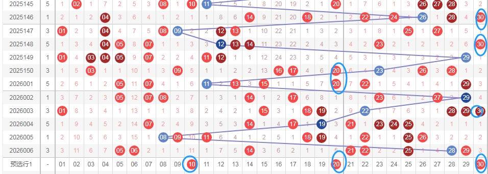 上图是福彩七乐彩开奖号码分布走势图,我在上面走势图中标注出来的数字都是0尾数的数字10 20 30可以发现最近0尾数的数字连续3期没出现,那么本期个人观点就是关注0尾数的数字10 20 30出1个或者2个。