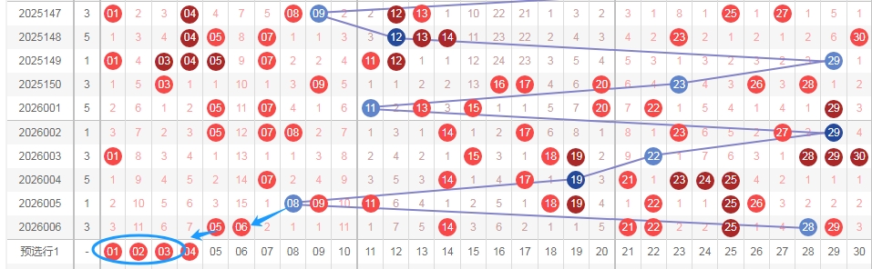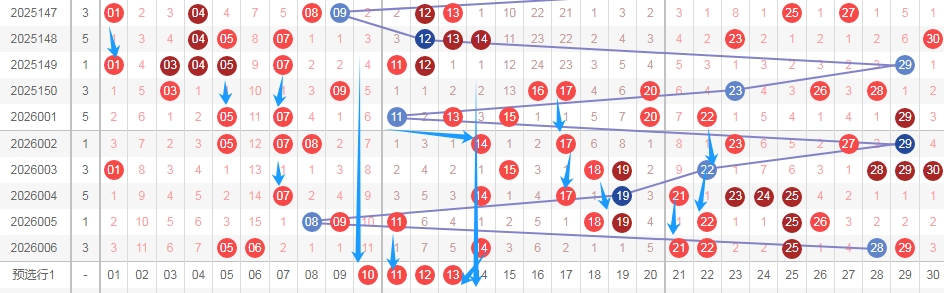 上图是福彩七乐彩开奖号码分布走势图,我在上面走势图中标注出来的数字01 02 03 04个人看好这四个数字出1个或者2个,因为这个区域的数字01 02 03 04连续3期没出现号码,最近6期也只出现了一个数字01,还有你们看我画出来的蓝色箭头,整个号码趋势都是往左边走动的,从0809走到0506,那么本期也可以继续往左边走动,所以本期个人观点01 02 03 04关注出1个或者2个。