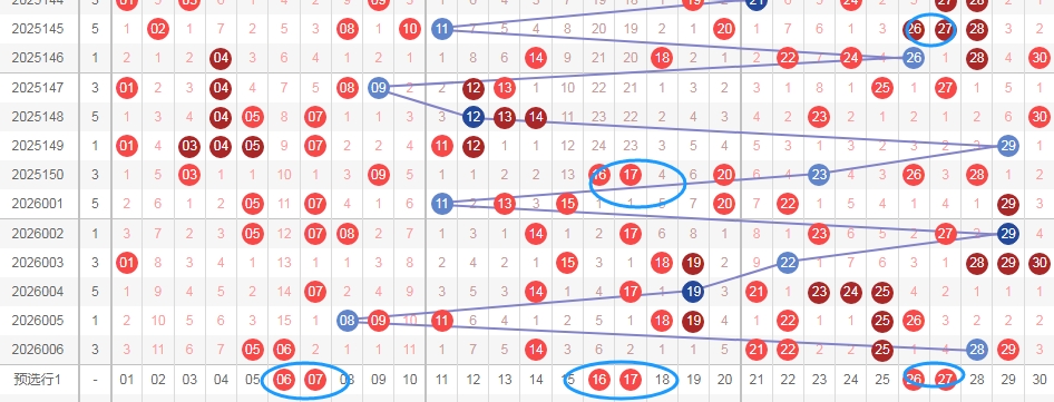 上图是福彩七乐彩开奖号码分布走势图,我在上面走势图中标注出来的数字都是6尾数和7尾数组成的连号组合,这些连号组合有0607 1617 2627足足连续6期没出现过,本期看好这些连号组合出一组或两组。