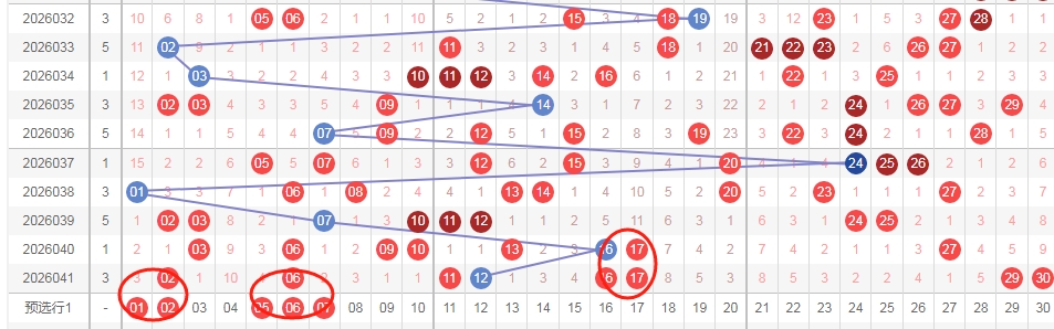 上图是福彩七乐彩开奖号码走势分布图,我标志出来的红色圈圈看看,上期开出了连号1617,其中数字17是重复的,那么按照这个走势来分析的话,上期开出了数字02本期可以看连号组合0102,上期开出了数字06,本期可以看连号组合0506和0607,那么你们看我画的红色圈圈,这三个圈圈是不是很相似。