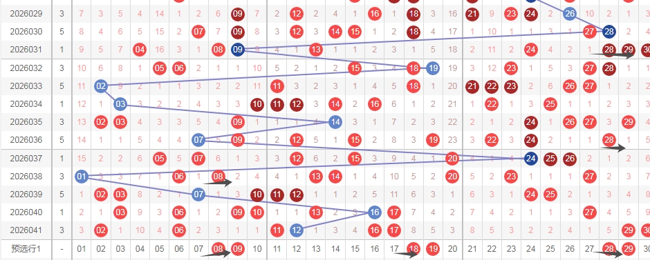 上图是福彩七乐彩开奖号码走势分布图,我标志出来的黑色箭头表示8尾数的数字,到本期为止8尾数数字已经连续遗漏了3期,最近几期8尾数数字出现的号码不多,那么本期可以关注8尾数的数字08 18 28出一个或者两个,那么可以关注8尾数数字和9尾数数字带出的连号组合,0809 1819 2829本期可以留意一下,这3组连号组合也连续10期没出现,上期开出的是上面横向标志出来的黑色箭头2829。