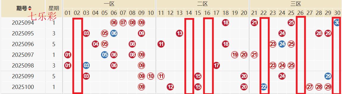 近七期开奖中一区出号数量为4+3+3+4+3+3+1=21枚,整体占比为42.9%;二区出号数量为1+1+2+2+1+3+3=13枚,整体占比为26.5%;三区出号数量为2+3+2+1+3+1+3=15枚,整体占比为30.6%。一区整体占比高于均值,周期内呈现下降趋势,鉴于整体波动,断区可能性不大。二区占比过低,呈现上升趋势,本期重点关注。三区占比低于均值,呈上升趋势,本期重点关注。基于动态平衡干预以及波动趋势衡量,本期七乐彩开奖三区比倾向于1:4:2。重点关注周期遗漏的2,14,16,22,26,30。