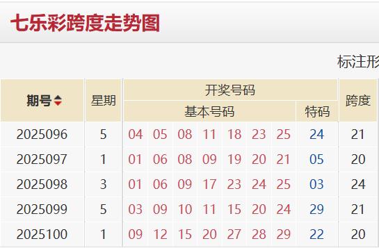 近五期七乐彩开奖号码跨度依次为21→20→24→21→20。周期跨度均值为21。周期跨度振幅为4。周期修正跨度振幅为3。基于动态平衡干预以及波动趋势衡量,本期开奖跨度推测区间为18-24。基于风险对冲策略,本期开奖跨度区间缩水为18-24。