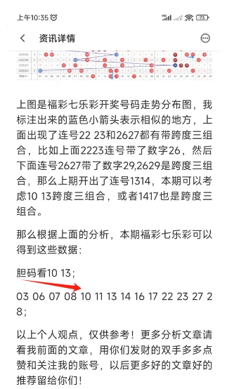 上图是上期福彩七乐彩号码分析文章的截图,我最后推荐的胆码10 13,开奖号码中有10 12,这个你们去看上期的号码分析文章吧。