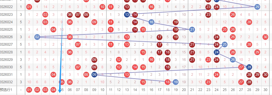 上图是福彩七乐彩开奖号码走势分布图,我在上面走势图中标注出来的数字01 02 03 04这个区域上期一个数字都没出现,最近7期这个区域也只开出了一个数字04,那么本期这个区域的数字开出的机会也是有的,关注这个区域的数字出2个或者3个吧。