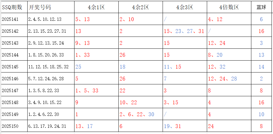 分享第一个数据分析:四分区统计数据。相对于传统的三分区,个人习惯使用四分区,就是把33个红球号码除以4,所得的余数分区如下: