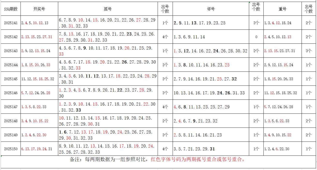 如图,以近两期数据为一组,进行对比分析。相同的孤号、邻号,可能在下期出1-4个左右。上期开出孤号4个,邻号1个,重号1个。本期参考孤号:1.2.3.4.8.9.10.11.15.21.22.26.27.28.29.33;邻号:5.7.12.14.16.18.20.23.25.30.32;孤、邻号重合号码精选:***(会员专区可见)。个人分析,仅供参考。