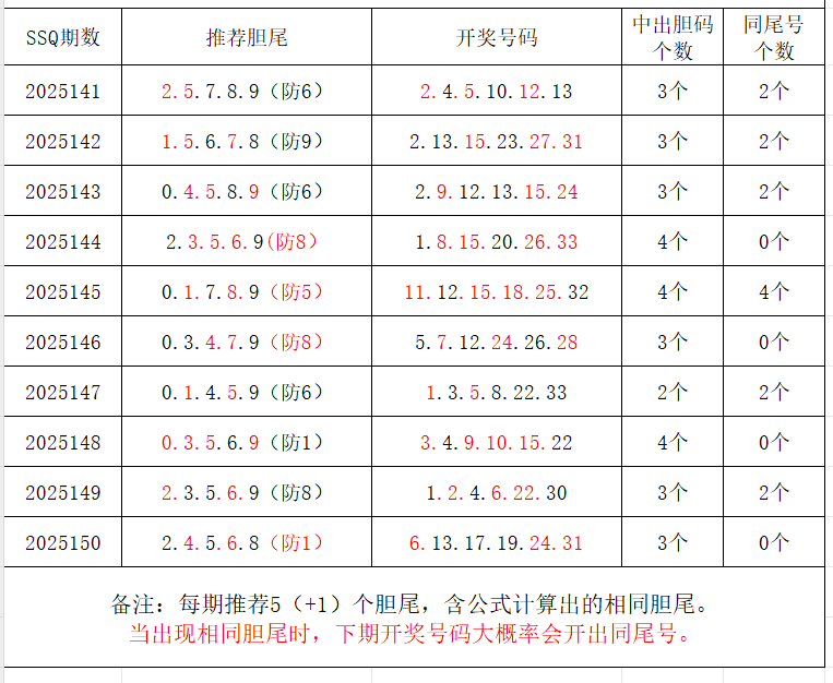 如图,每期推荐胆尾中出1-4个。上期推荐胆尾中出3尾3码!推荐胆尾是按照公式计算的顺序,不定位红球号码的顺序。本期推荐胆尾:1尾/5尾/7尾/4尾/9尾  。加推重点胆尾:***(会员专区可见)。推荐胆码号码:***(会员专区可见)。个人分析,仅供参考。