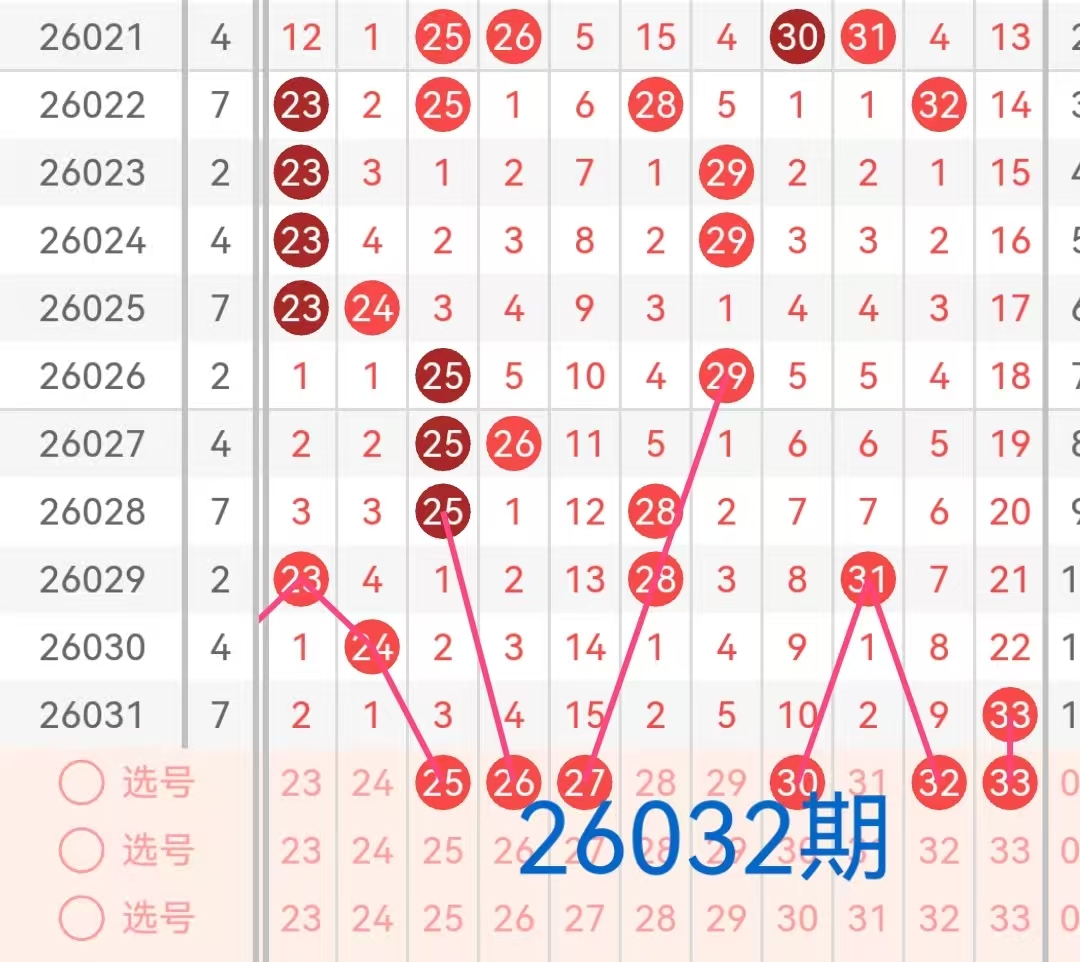 3. 第三区间(23-33):此区间开出一个号码33,号码33为该期凤尾号码,在遗漏22期后开出。由于上期凤尾号码最大,本期预计号码会由此减小,预计凤尾号码会在本区间内开出。尤其是那些表现较好的号码,如号码27、30、32、33根据历史开奖来看,最近该区间近期活跃度较低,本期考虑该区号码会有1-2号码继续开出。因此本区间关注号码25、26、27、30、32、33