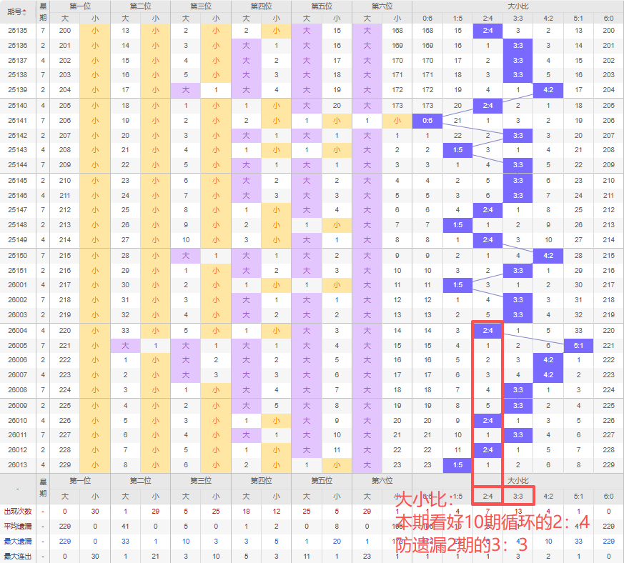 上期大小比:1:5,近10期大小比出现情况:2:4、5:1、4:2、4:2、3:3、3:3、2:4、3:3、2:4、1:5,最近10期出现3期3:3,出现2期4:2,出3期2:4,出现1期5:1,出现1期1:5,出现0期6:0,出现0期0:6,根据近10期规律本期看好10期循环的2:4,防遗漏2期出3:3,综上所述推荐大小比推荐:3:3,重点关注:2:4。