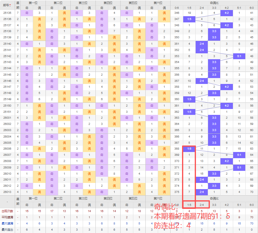 上期奇偶比:2:4,近10期奇偶比出现情况:3:3、3:3、1:5、5:1、4:2、5:1、3:3、2:4、3:3、2:4,最近10期出现4期3:3,出现1期4:2,出现2期2:4,出现2期5:1,出现1期1:5,出现0期6:0,出现0期0:6,根据近10期规律本期看好遗漏7奇的1:5,防连出2:4,综上所述推荐奇偶比推荐:2:4,重点关注:1:5。
