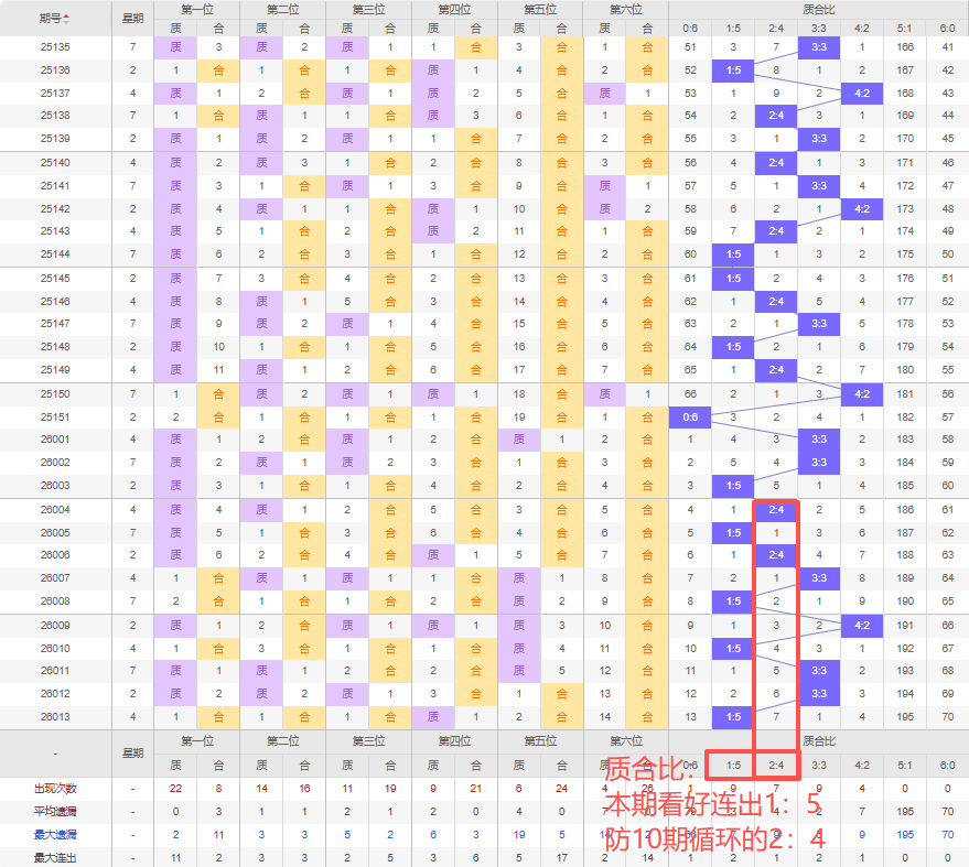 上期质合比:1:5,近10期质合比出现情况:2:4、1:5、2:4、3:3、1:5、4:2、1:5、3:3、3:3、1:5,最近10期出3期3:3,出现1期4:2,出现2期2:4,出现0期5:1,出现4期1:5,出现0期6:0,出现0期0:6,根据近10期规律本期看好连出的1:5,防10期循环的2:4,综上所述推荐质合比推荐:2:4,重点关注:1:5。