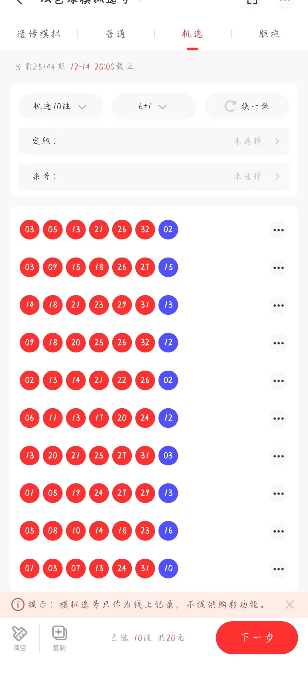 路径就是彩虹软件里面的模拟选好功能,然后选择机选,机选10注,这样我们就会得到一组10注的号码,我们需要大量的10注号码然后进行统计,我这里的选择是蓝码选择3组25注的统计,3组50注的统计,红码选择的是3组25注的统计,然后对数据进行对比研究,可以查看统计的情况记录,如下图(关注必杀蓝码重点:连续的组数据进行从下面开始网上开始10个码,然后通过两两对比,得出相同出号的作为选码,如果超过了5个号码就人工的筛选杀号,凑到5码均可,这里有一个重点就是每一组数据都是通过上面截图的办法出来的25组单注,然后通过3次25组单注的合计出来一组蓝码,通过这样的方式出来的选号,准确率尚且较高,可以有不少的参考价值)