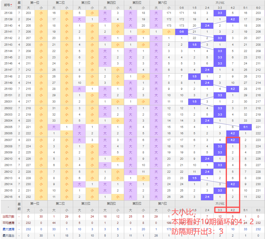 上期大小比:2:4,近10期大小比出现情况:4:2、3:3、3:3、2:4、3:3、2:4、1:5、4:2、3:3、2:4,最近10期出现4期3:3,出现2期4:2,出3期2:4,出现0期5:1,出现1期1:5,出现0期6:0,出现0期0:6,根据近10期规律本期看好10奇循环出4:2,防隔期出3:3,综上所述推荐大小比推荐:3:3,重点关注:4:2。