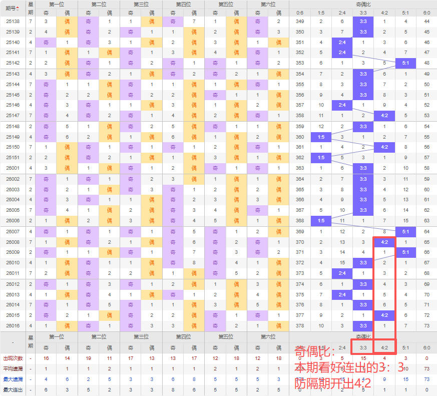 上期奇偶比:3:3,近10期奇偶比出现情况:5:1、4:2、5:1、3:3、2:4、3:3、2:4、3:3、4:2、3:3,最近10期出现4期3:3,出现2期4:2,出现2期2:4,出现2期5:1,出现0期1:5,出现0期6:0,出现0期0:6,根据近10期规律本期看好连出的3:3,防隔期开的4:2,综上所述推荐奇偶比推荐:4:2,重点关注:3:3。
