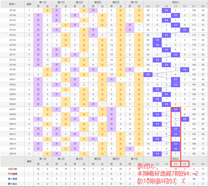 上期质合比:1:5,近10期质合比出现情况:3:3、1:5、4:2、1:5、3:3、3:3、1:5、3:3、3:3、1:5,最近10期出5期3:3,出现1期4:2,出现0期2:4,出现0期5:1,出现4期1:5,出现0期6:0,出现0期0:6,根据近10期规律本期看好遗漏7期的4:2,防10期循环的3:3,综上所述推荐质合比推荐:3:3,重点关注:4:2。