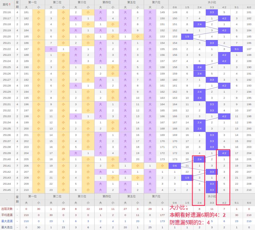 上期大小比:3:3,近10期大小比出现情况:3:3、3:3、3:3、4:2、2:4、0:6、3:3、1:5、3:3、3:3,最近10期出现6期3:3,出现1期4:2,出1期2:4,出现0期5:1,出现1期1:5,出现0期6:0,出现1期0:6,根据近10期规律本期看好遗漏6期的4:2,防遗漏5期出2:4,综上所述推荐大小比推荐:2:4,重点关注:4:2。