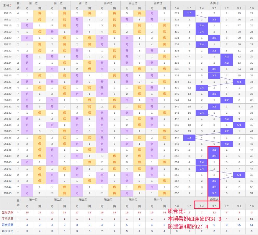 上期奇偶比:3:3,近10期奇偶比出现情况:4:2、1:5、4:2、3:3、3:3、2:4、2:4、5:1、3:3、3:3、3:3,最近10期出现5期3:3,出现1期4:2,出现2期2:4,出现1期5:1,出现1期1:5,出现0期6:0,出现0期0:6,根据近10期规律本期看好四连出3:3,防遗漏4期的2:4,综上所述推荐奇偶比推荐:2:4,重点关注:3:3。