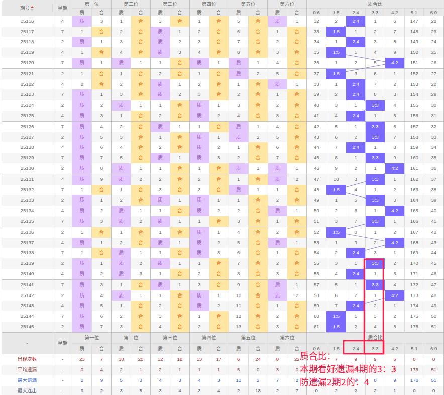 上期质合比:1:5,近10期质合比出现情况:1:5、4:2、2:4、3:3、2:4、3:3、4:2、2:4、1:5、1:5,最近10期出2期3:3,出现2期4:2,出现3期2:4,出现0期5:1,出现3期1:5,出现0期6:0,出现0期0:6,根据近10期规律本期看好遗漏4期的3:3,防遗漏2期出2:4,综上所述推荐质合比推荐:2:4,重点关注:3:3。