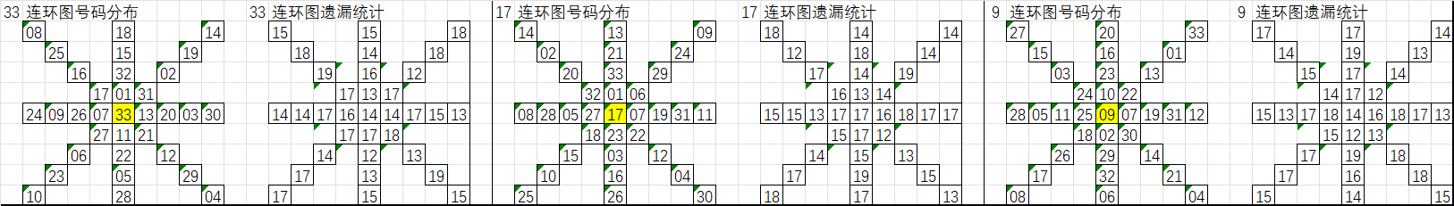 由于数据量大,不一一统计,下图为各个号码分别在33、17、9连环图上的遗漏统计汇总图: