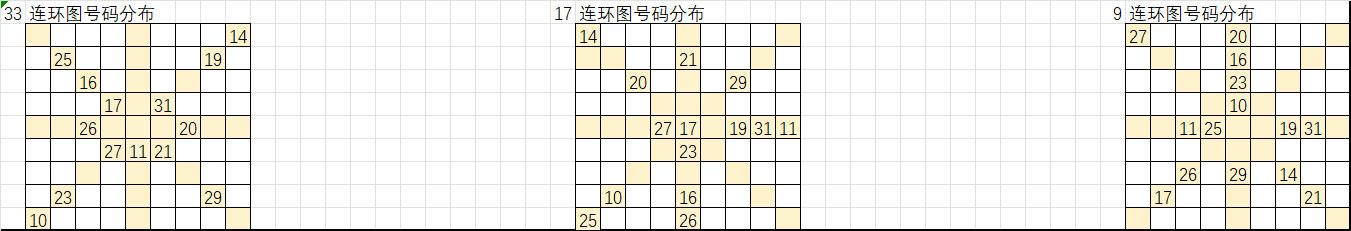 以上是遗漏大于16的号码分别在33、17、9连环图的分布,按照九转连环图选号规律,选取这些号码“环上”和“轴上”的相邻号码作为胆码,把这些胆码进行次数统计即可形成我们组号的排序,从出次多到少进行取号得出我们的大底。