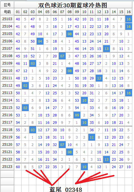 蓝球本期有热蓝8枚,冷蓝8枚,蓝球热码数量一样。上期开出热蓝,由于近期蓝球冷热交替开出规律不明显,本期蓝球冷热难定。