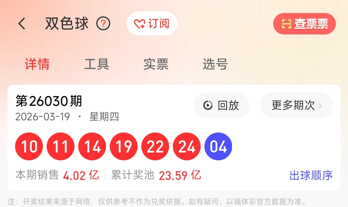 首先让我们回顾一下上期双色球26030期的开奖号码为10、11、14、19、22、24,蓝球04。和值100,跨度14,区间比为2:3:1,奇偶比为2:4。