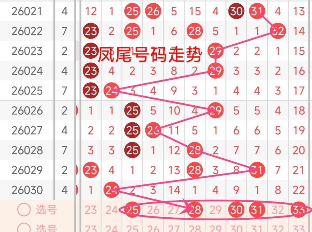 上期凤尾号码为24,振幅下降了7点,开出了偶数号码。回顾近期凤尾号码,振幅波动较大。上期凤尾为24,近期凤尾集中在24-32区间,且整体呈上升趋势。本期凤尾有望向高位延伸,预计在25-33区间产生。25与上期凤尾24相邻,走势连贯;30作为大号冷号,遗漏期数较长,具备回补可能性。本期还需注意连续多期漏出的号码,有望在本期回补凤尾开出。本期凤尾号码可重点关注25、28、30、31、33。
