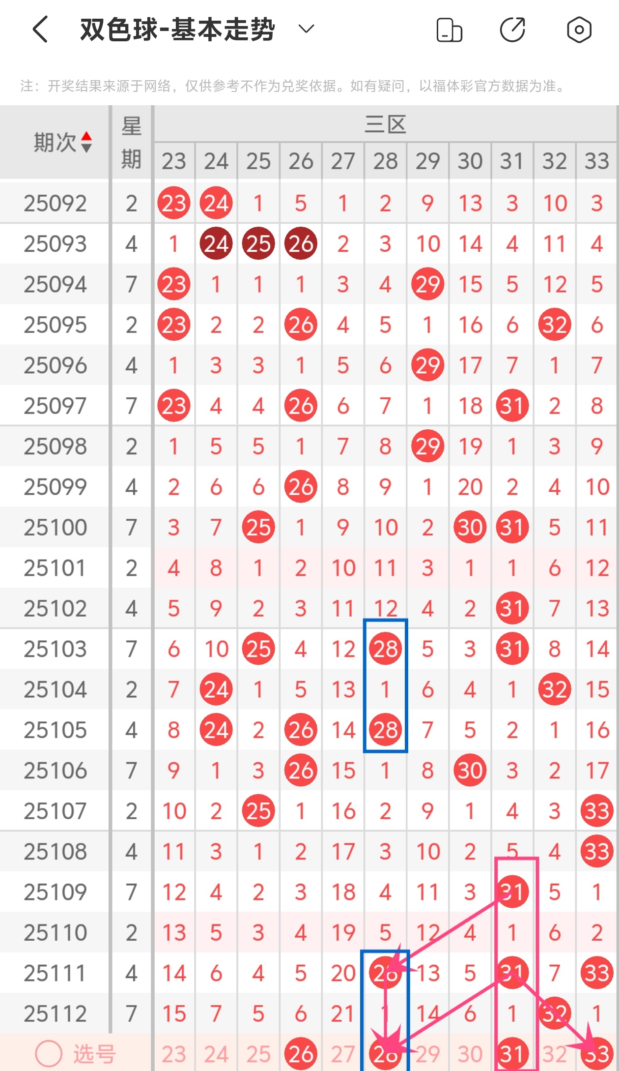 上期第三区间开出32,本期我们可以从上面走势图中看到选号的思路,28为对称走势,31为对称走势,33为斜连走势,综合以上分析本期第三区间推荐26 28 31 33
