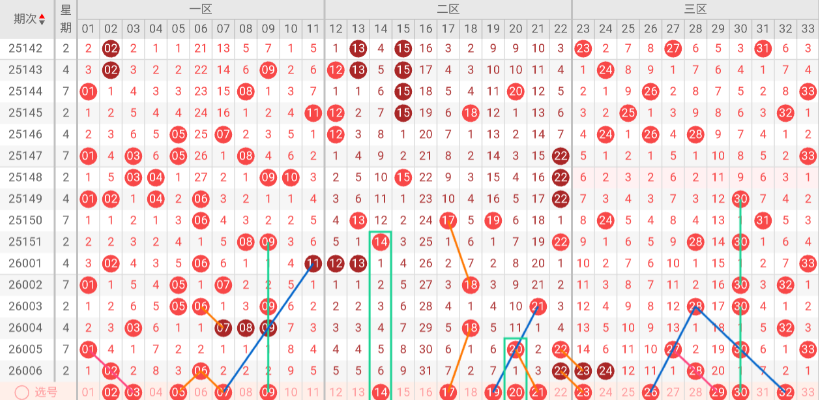 呈现探底后强势拉升并高位企稳的鲜明对比。从2码探至1码后,连续两期强势输出3码,迅速进入并维持在高热平台期。这与二区的低迷形成强烈反差。该区间处于明确的过热状态。根据热极转冷的常见节奏,~。但考虑到该区是凤尾的主要产出区,热度不会骤然消失。出号量大概率回调至1-2码。策略~。关注~。建议关注号码:23、26、29、30、32。