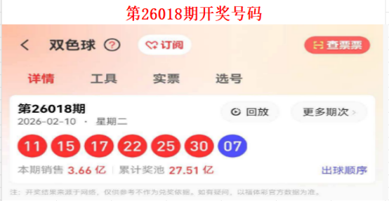 · 2026018期(2月10日) 红球:11、15、17、22、25、30 | 蓝球:07