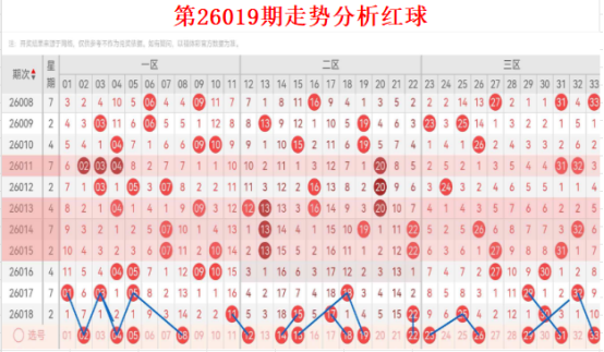 · 连号:018期无连号。近20期连号遗漏从未超过2期,本期必防连号。重点区域:二区中段(17-19)、三区前端(23-26) 。