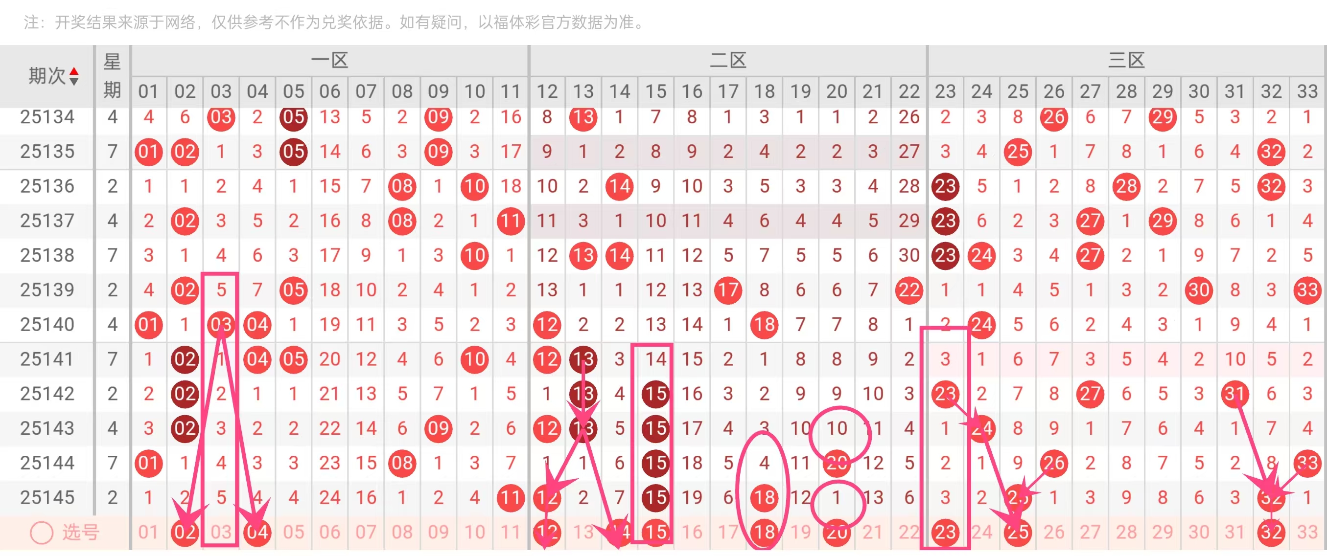 区域分布:红球中区(13-24)出现频率较高,两端(01-12、25-33)相对分散。