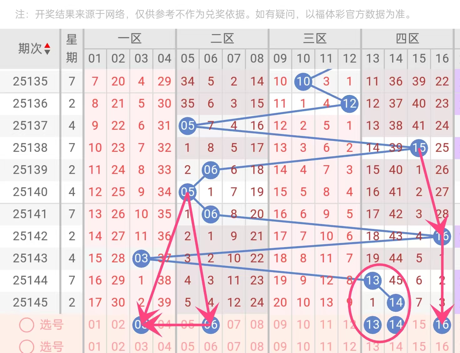 热区聚焦:近期蓝球以10以上为主,13、14、16均属该区间,且14、16在近5期已出,历史常见“蓝球重复”现象;13作为上期邻号(14-1),回补概率高。