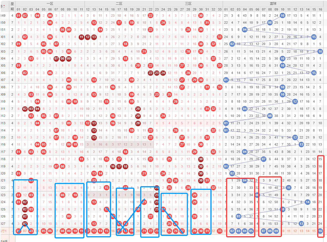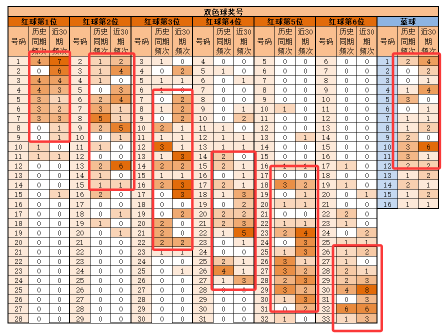 6位,基本在24-33之间,历史同期频次最多的3230期,频次最多的为30,明显特征是合数优势;推荐重29-30-31-32-33