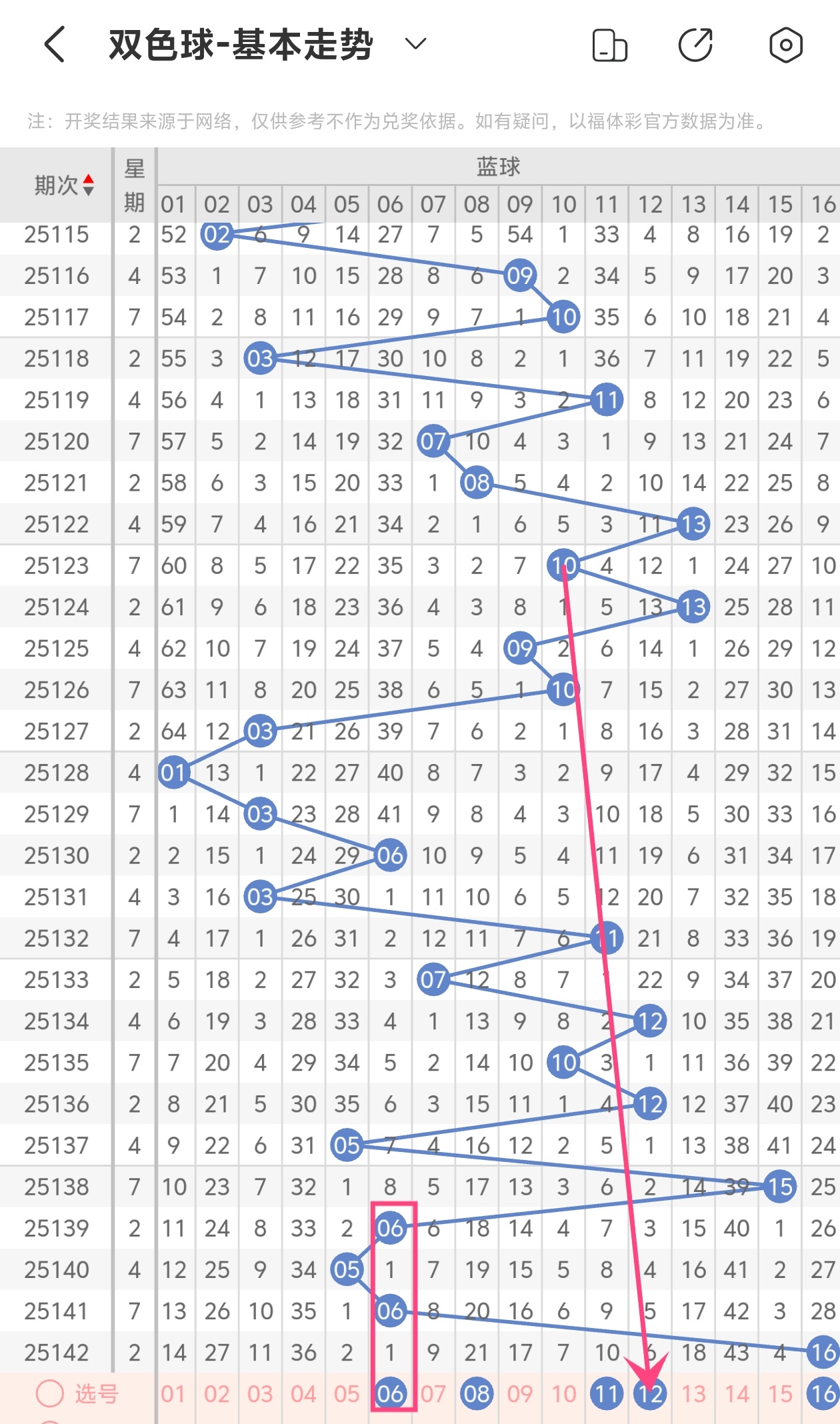 上期蓝球开出16,本期我们可以从上面走势图中看到选号的思路,06为对称形态走势,12为斜连走势,16为重码,综合以上分析本期蓝球推荐06 08 11 12 16