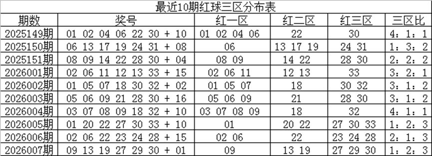 一区上期走温,出现1个奖号,近10期开出24个红球,表现非常活跃,本期预计走温,开出1-2个红球,参考号码04;二区上期走温,开出2个红球,近10期共开出16个红球,走势相对较冷,本期注意回补,看好该区热出,关注3个红球,注意号码12、13、17;三区上期表现较热,出现3个奖号,近10期共开出20个红球,出号与理论个数持平,本期预计继续走温,出现1-2个红球,看好号码29、30;