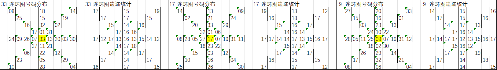 由于数据量大,不一一统计,下图为各个号码分别在33、17、9连环图上的遗漏统计汇总图: