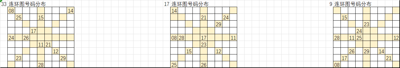 以上是遗漏大于16的号码分别在33、17、9连环图的分布,按照九转连环图选号规律,选取这些号码“环上”和“轴上”的相邻号码作为胆码,把这些胆码进行次数统计即可形成我们组号的排序,从出次多到少进行取号得出我们的大底。