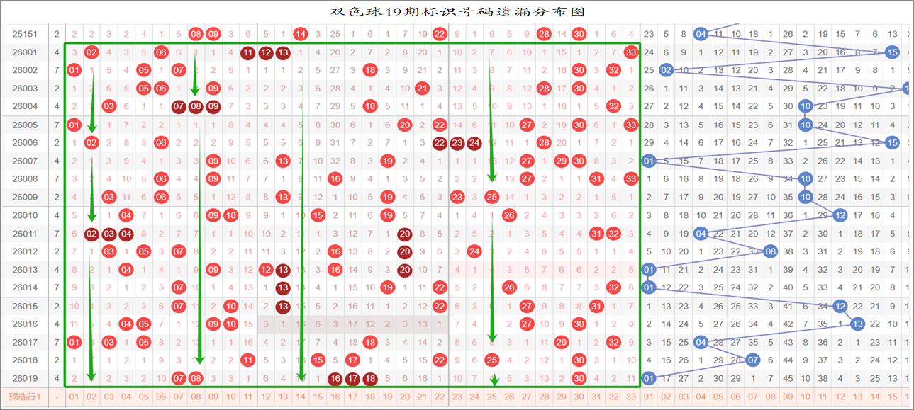 以上是33、17、9的连环图,可以在一起彩平台的九转连环图中查看历期号码分布,以当前期数来看,我们以19期号码来进行遗漏统计,然后把每个号码在近19期的遗漏总数统计出来,分别带入33、17、9的连环图,取出遗漏值大于16的号码,把这些号码在“环上”和“轴上”的相邻号码取出来进行统计,选取出次前15的号码作为大底。
