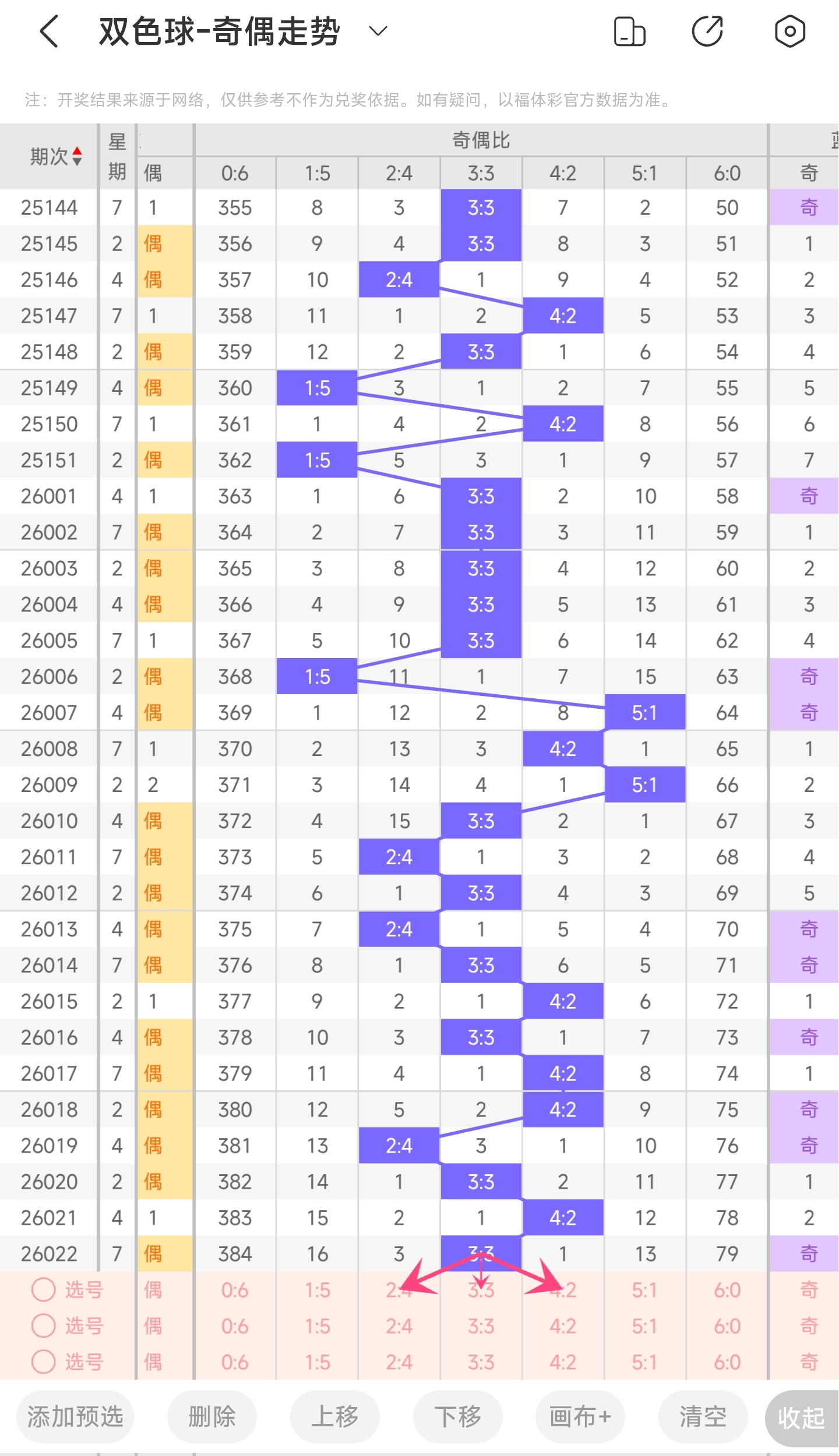 上期奇偶比为3:3,分别为奇偶奇奇偶偶。往前一期奇偶比为4:2。通过近30期内奇偶走势的数据分析,目前1:5奇偶比开出的概率是10%,5:1奇偶比开出的概率是6.66%,3:3奇偶比开出的概率是46.66%,4:2奇偶比开出的概率是23.33%,2:4奇偶比开出的概率是13.33%,6:0奇偶比开出的概率是0%。与前一期相比,概率没有变化。通过分析走势图,上期开了3:3奇偶比,本期比较看好4:2奇偶比,其次是3:3奇偶比和2:4奇偶比。所以本期推测本期可能开4:2奇偶比,其次是3:3和2:4奇偶比,最后是1:5和5:1奇偶比。