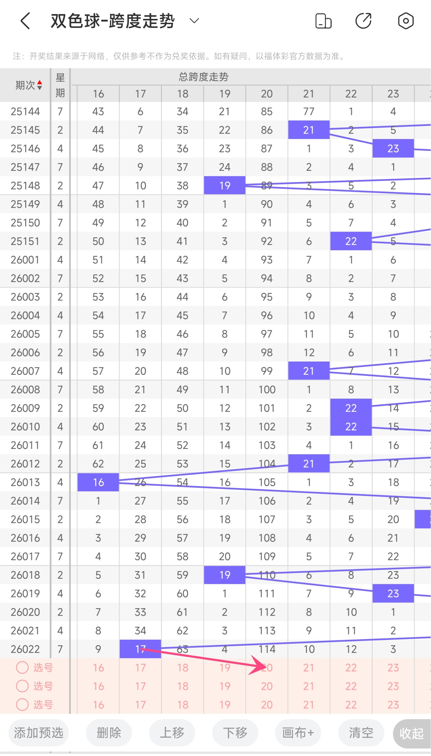 上期龙头为15,凤尾为32,跨度为17,往前一期跨度是28,偏移量为11。17跨度值是30期内开出第二小的跨度值。上升的空间很大,下降空间很小,本期看好跨度变大,所以推测本期跨度趋势是往右的,跨度变大,小概率往左,跨度变小。