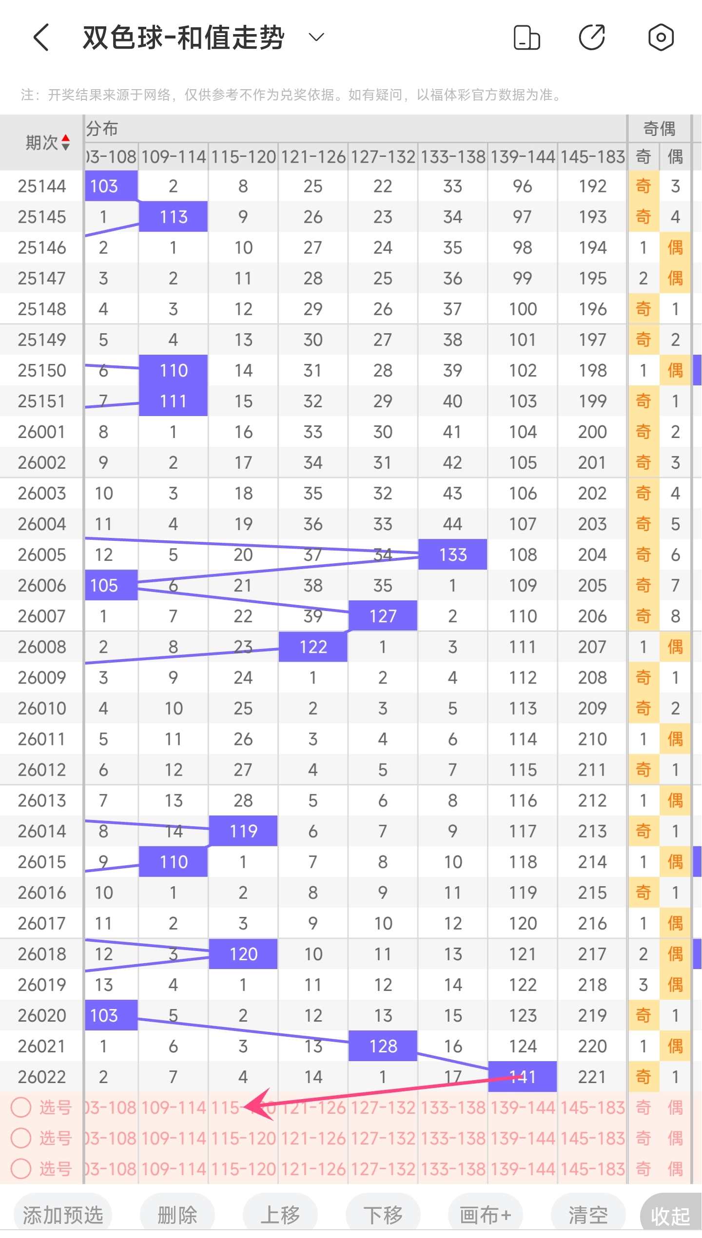 上期和值为141,而近5期和值为120,96,103,128,141,上期和值较前一期增加了13,振幅为13。141和值是属于近30期内开出的最大的和值,下降的空间很大,上升的空间非常小。本期看好和值变小,所以推测本期和值趋势是大概率往左,和值变小,小概率往右,和值变大。
