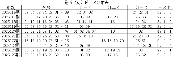 一区上期走温,出现2个奖号,近10期开出23个红球,表现非常活跃,本期预计走温,开出1-2个红球,参考号码05、11;二区上期走温,开出2个红球,近10期共开出13个红球,走势相对较冷,本期注意回补,看好该区热出,关注3个红球,注意号码14、18、21;三区上期走温,开出2个红球,近10期共开出24个红球,出号比例相对较高,本期预计走温,开出1-2个红球,看好号码27;