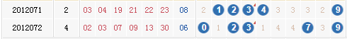 根据奇偶走势,012路走势和振幅,本期小码蓝球看好01和07,大码蓝球看好09.14.15。