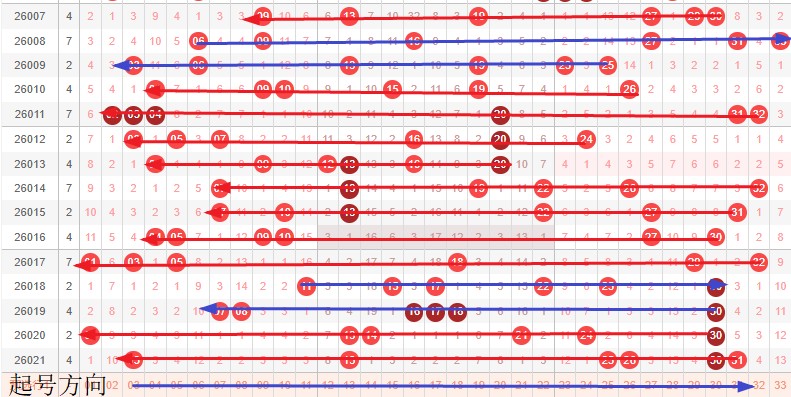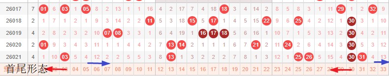如图所示:首尾制约平衡组范围依次为:拉缩拉,拉推? 本期形态范围优先选择红色左推首尾。由于上期号码已经进入新走势第3期,目前处在新走势第4期,利用常规起号形成推进还是拉伸就是走势正反方向。