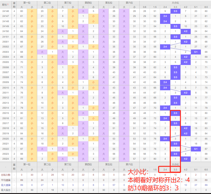 上期大小比:4:2,近10期大小比出现情况:、3:3、2:4、3:3、4:2、4:2、2:4、3:3、5:1、3:3、4:2,最近10期出现4期3:3,出现3期4:2,出现2期2:4,出现1期5:1,出现0期1:5,出现0期6:0,出现0期0:6,根据近10期规律本期看好对称开出2:4,防10期循环的3:3,综上所述推荐大小比推荐:3:3,重点关注:2:4。