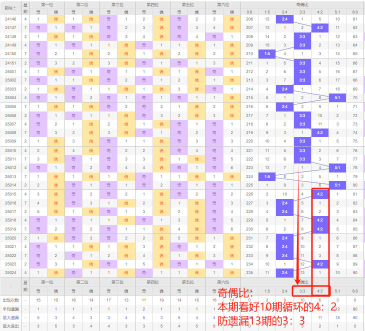 上期奇偶比:2:4,近10期奇偶比出现情况:4:2、2:4、2:4、4:2、4:2、2:4、2:4、2:4、4:2、2:4,最近10期出现0期3:3,出现4期4:2,出现6期2:4,出现0期5:1,出现0期1:5,出现0期6:0,出现0期0:6,根据近10期规律本期看好10期循环的4:2,防遗漏13期的3:3,综上所述推荐奇偶比推荐:3:3,重点关注:4:2。